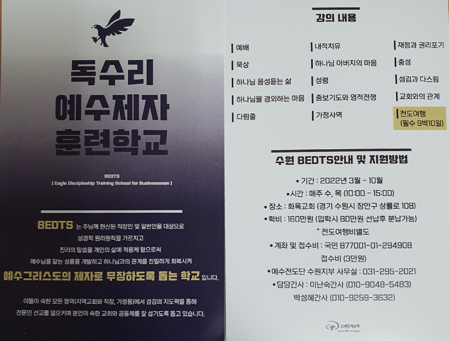 독수리예수제자훈련학교는 직장인, 주부, 일반인을 대상으로 하는 훈련프로그램으로