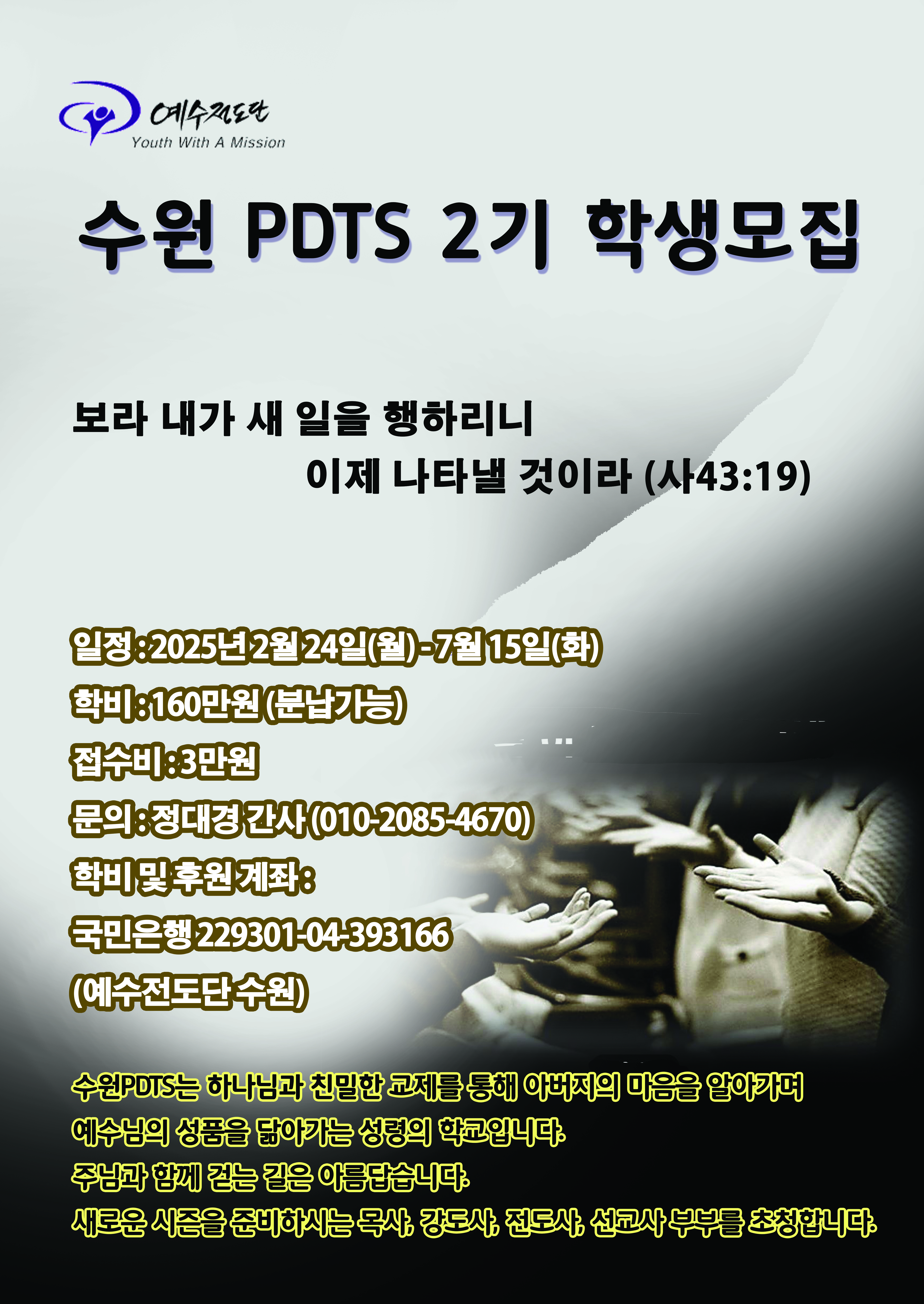 접수처 : 예수전도단 수원지부 사무실 경기도 수원시 장안구 일월로 90번길 2 효원빌딩 3층